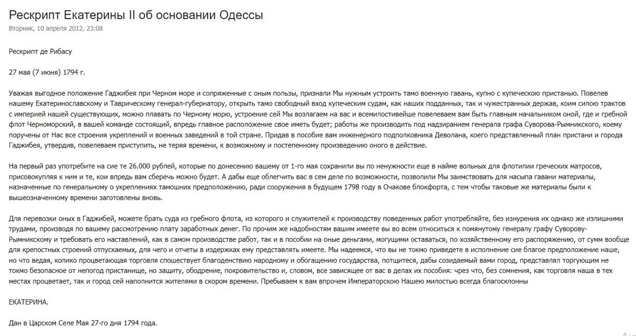 (насправді — ні, вона просто її перейменувала, а знаменитий “рестрикт про заснування Одеси”, насправді — рестрикт про розбудову місцевого порта).