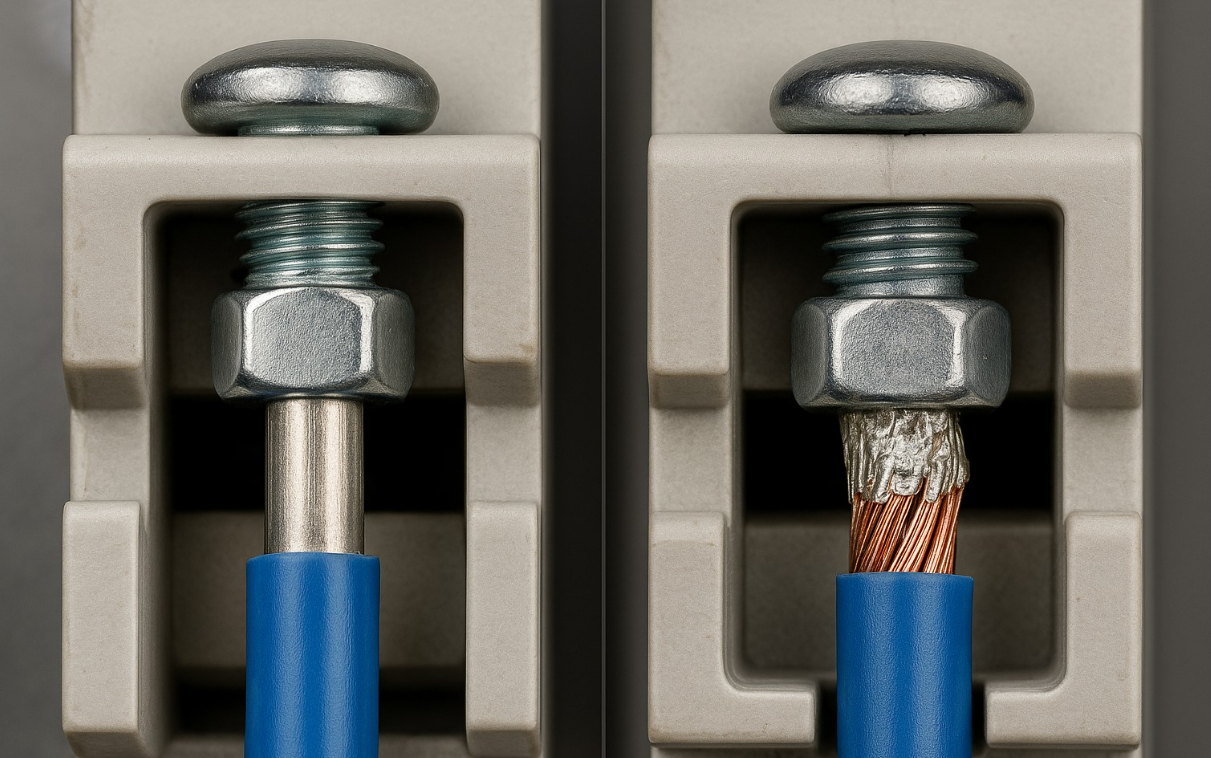 Термоцикли роблять свою справу. Метал розширюється при нагріві, стискається при охолодженні, гвинт поступово відпускає контакт. Додаємо вібрації від пусків насосів чи компресорів, трохи вологості і корозії і контактний опір росте як дріжджі. Добра новина проста. Правильне закінчення жили і коректна клема рішуче зменшують ці ризики.